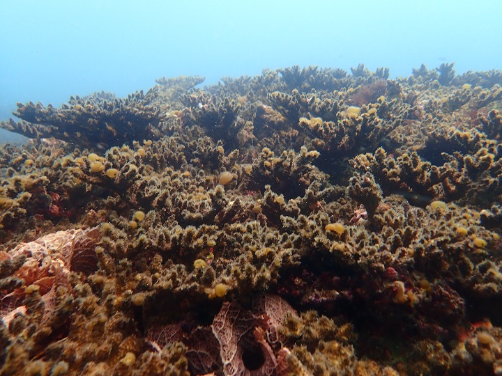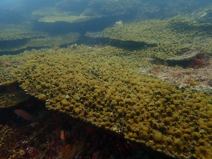 ご覧のとおりサンゴの上に海藻が生えております。