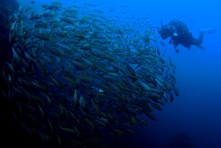 じゃあ何??と思って潜っていくと、1万匹ぐらいのイワシが大暴れ!!!